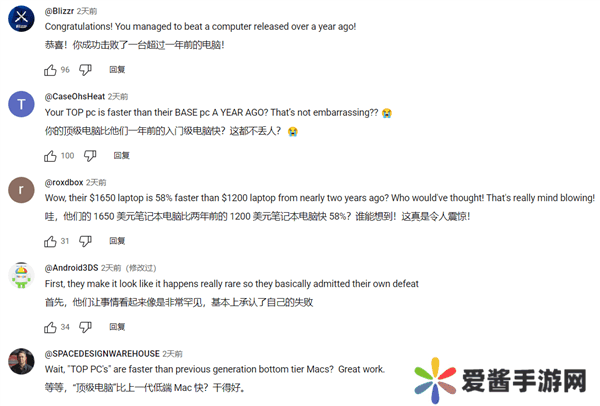 视频一经发布,评论区迅速沦陷为网友们的吐槽之地。有人调侃道:“恭喜你们,成功战胜了一款已经上市一年的笔记本!”更有尖锐的声音指出:“真是难以置信,一款售价高达1650美元的电脑,竟然只比两年前售价1200美元的旧款快了58%,这简直是个笑话!”还有人反问:“你们最顶尖的产品,竟然只能比人家一年前的入门级产品快这么一点,不觉得尴尬吗?”