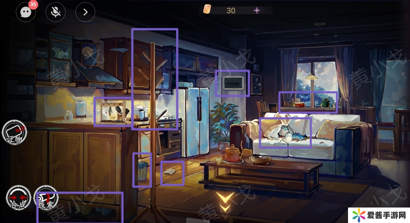 15.收集线索:沙发上的〖衣服〗、餐桌上的〖餐具〗、地上的〖抹布〗和〖*桶〗、墙上的〖电闸〗、〖钥匙架〗、〖衣架〗、鞋柜里的〖拖鞋〗
