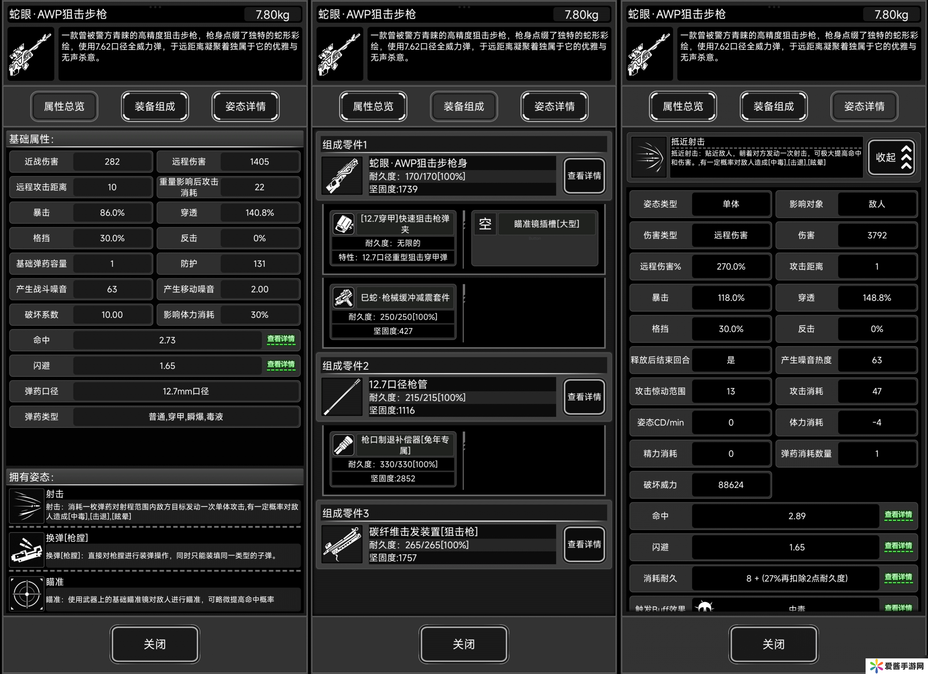 活下去蛇年武器测评·蛇眼AWP如下: 蛇眼·AWP狙击步枪 蛇年必换武器之一,抵近射击极低的dp消耗搭配极高的伤害倍率,姿态无CD并附带中毒/击退/眩晕,能一直处于巅峰状态持续爆发,本帖主要测试有...
