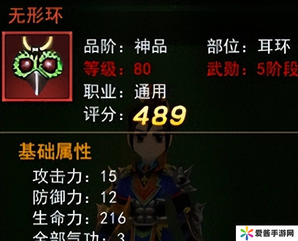 3、无形环为80级武勋耳环,比鬼眼灵珠更加强力,有着全部气功+3的属性,获得方式同样是在神级悬赏任务中开箱子有几率获得碎片,不过是需要开启81级的神级任务宝箱才有几率开出来。