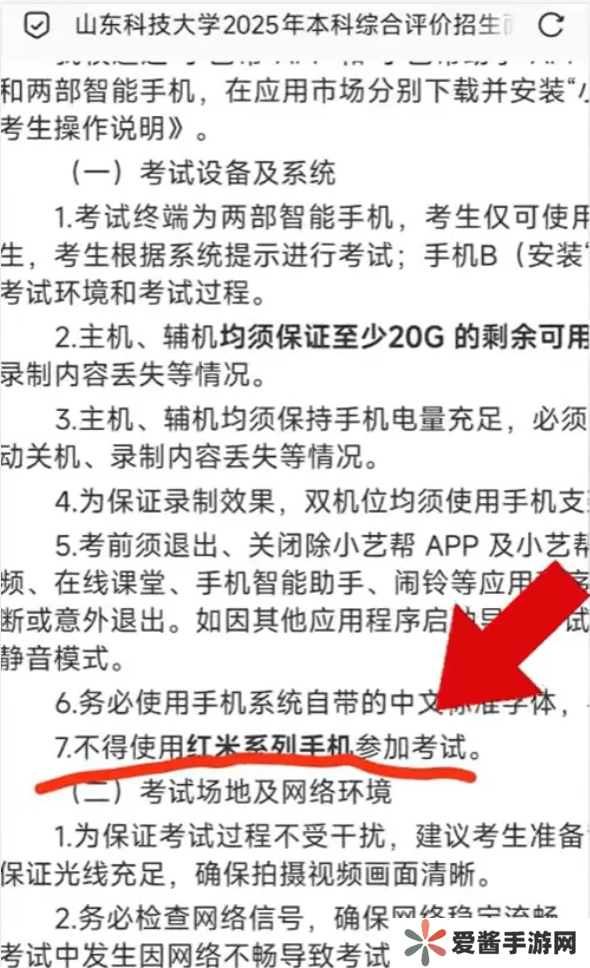 据了解,该消息源自一份网友分享的山东科技大学2025年本科综合评价招生面试考生须知截图。截图内容显示,在即将进行的招生面试中,学校明确提出了不得使用红米系列手机参加考试的要求。