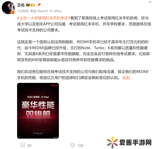 王化进一步解释称,REDMI品牌如今已经实现了全面升级,旗下的Note、Turbo、K等系列手机均以卓越的质量和性能著称。特别是K系列,作为豪华性能旗舰,其性能表现完全能够满足各种在线考试的需求。因此,禁用红米手机参加考试的规定,确实让人感到有些意外。