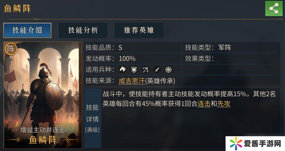 没有本汗拆不掉的城,只有你跟不上的节奏!成吉思汗的传承技能“鱼鳞阵”主要效果为增益主动并连击:战斗中,可以使技能持有者主动技能发动概率提高15%,其他2名英雄每回合有45%概率获得1回合连击和先攻。