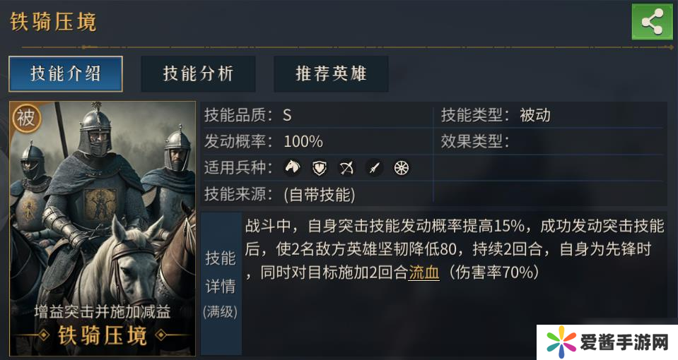 当马蹄踏碎星辰,连上帝也要为蒙古铁骑开门!成吉思汗的自带技能“铁骑压境”主要效果就是增益突击并施加减益:战斗中,自身突击技能发动概率提高15%,成功发动突击技能后,使2名敌方英雄坚韧降低80,持续2...