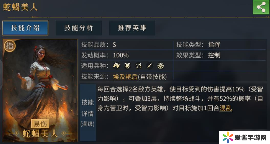 【自带技能-蛇蝎美人】每回合选择2名敌方英雄,使目标受到的伤害提高10%(受智力影响),可叠加3层,持续整场战斗,并有52%的概率(自身为营卫时,受智力影响)对目标施加1回合混乱。
