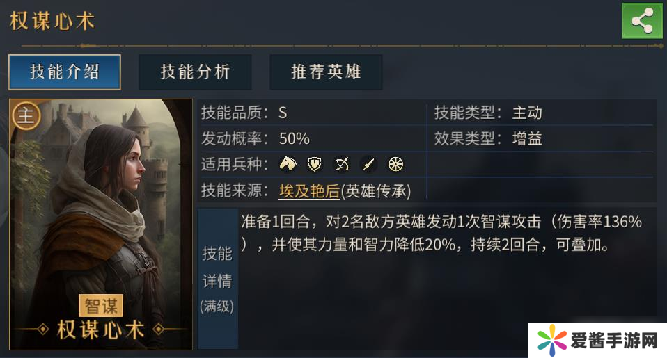 【传承技能-权谋心术】准备1回合,对2名敌方英雄发动1次智谋攻击(伤害率136%),并使其力量和智力降低20%,持续2回合,可叠加。